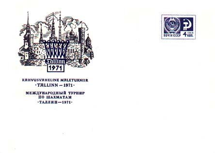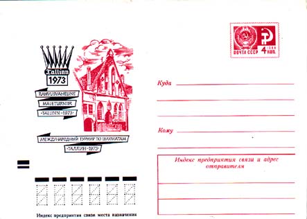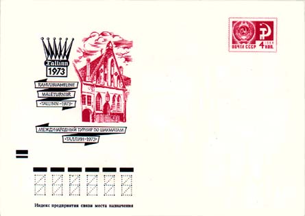 ХМК-11. 11.01.73. Международный шахматный турнир "Таллин-73". Без адресных линеек. Самый малотиражный "шахматный" ХМК СССР - тираж 0,02 млн. * The international chess tournament "Tallin-73". Without address lines. Most limited "chess" illustrated postal stationery envelope USSR - circulation 20 000.